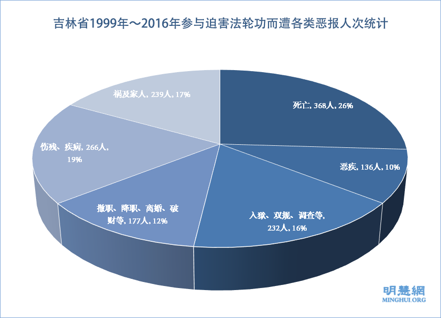 根据【明慧网】曝光的1999年~2016年恶人恶行导致恶报的案例所做的不完全统计,吉林省共有1418人遭到不同程度的报应。其中本人遭报人数为1179人;祸及家人239人。