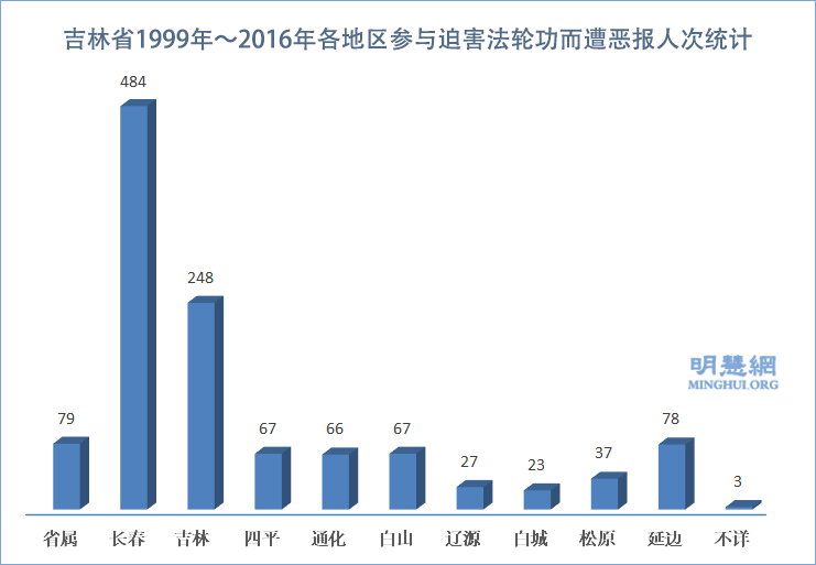![]() 图3:吉林省1999年~2016年各地区参与迫害法轮功而遭恶报人次统计 |