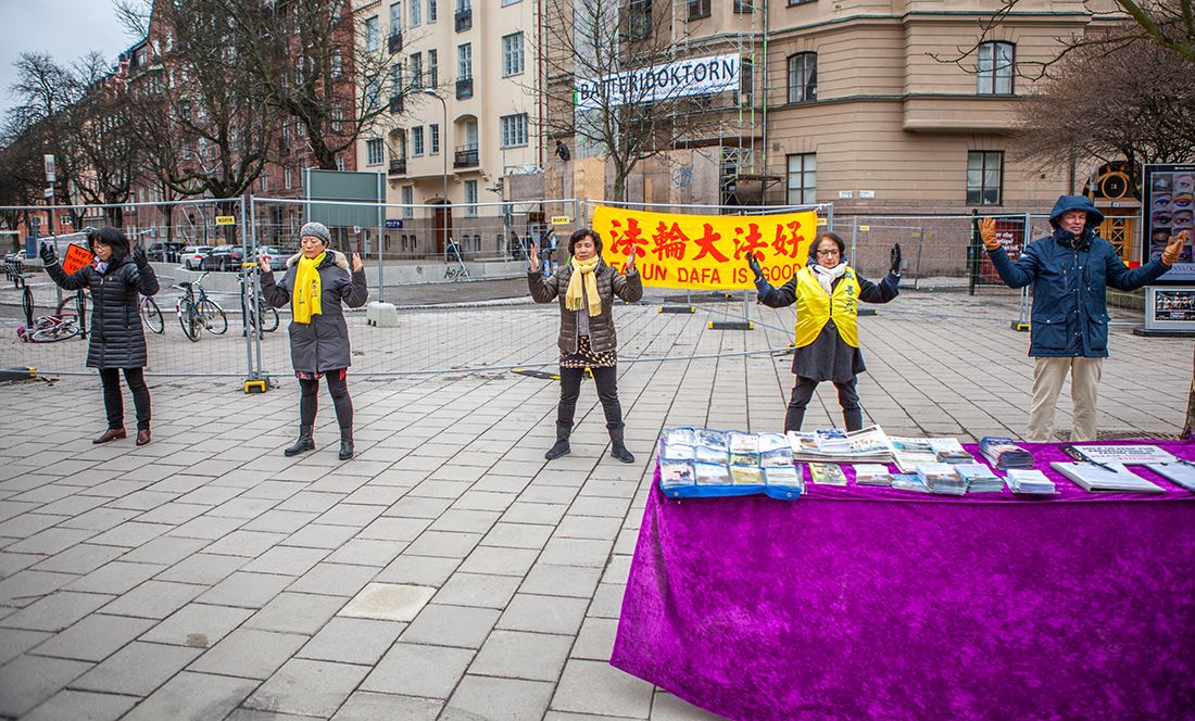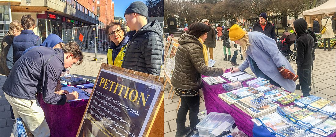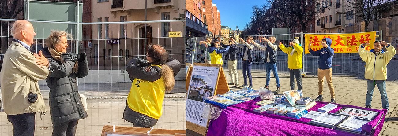 优美的炼功音乐、宁静祥和、充满能量的炼功场面,常常吸引了很多居住在附近的居民驻足观看。三月二十七日周一这天中午,一群瑞典的初中生来到了活动场地前,他们有的在仔细阅读真相展板、有的在拍照,有的站着学员中体验炼功动作,得知中共用如此残暴的手段还在迫害修炼真善忍的好人时,他们都毫不犹豫的地在制止迫害签名表上签了名。