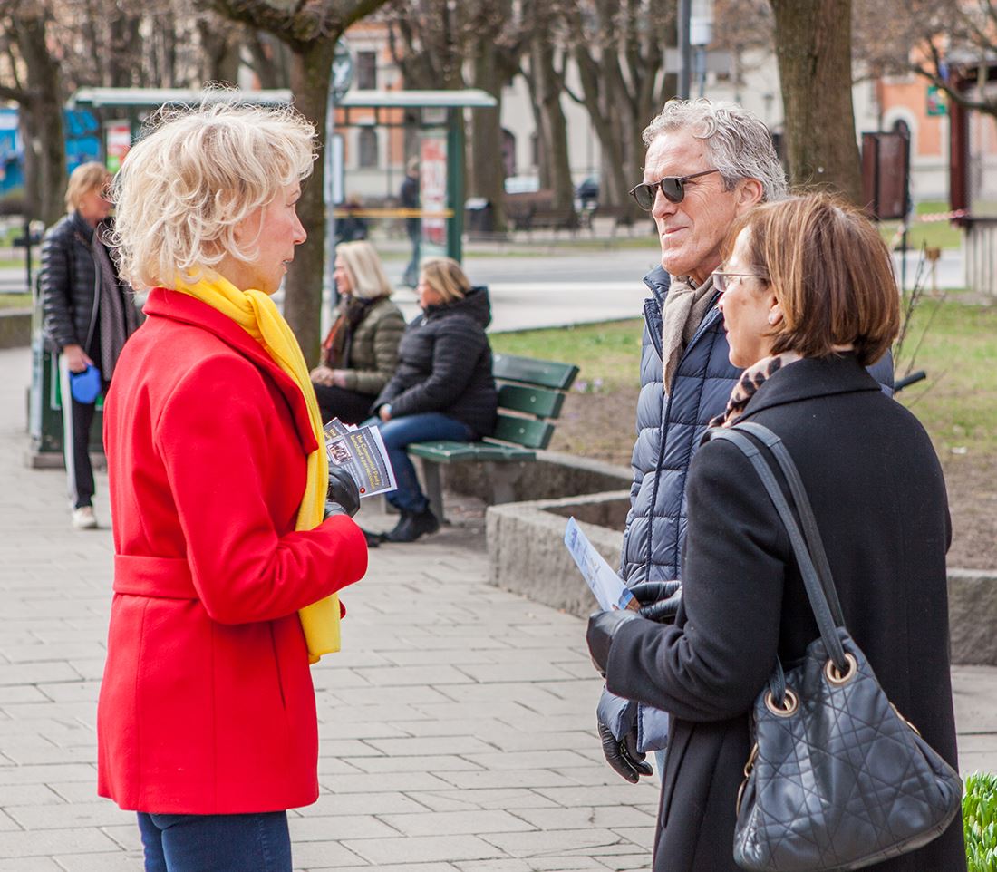 四月三日周一这天,一位身穿红色大衣的瑞典女士站着真相展板前仔细的阅读,看完全部真相展板后,她主动走到征签簿前,在制止中共活摘器官的征签簿上签了名。学员中有人一眼认出这位签名的女士是瑞典前文化部部长莲娜·丽莉茹特(Lena Adelsohn Liljeroth),就主动上前和她打招呼,莲娜很高兴。原来她早就退休了,今天出来和家人散步路过这里。看得出她对学员在这里搞活动很是高兴。