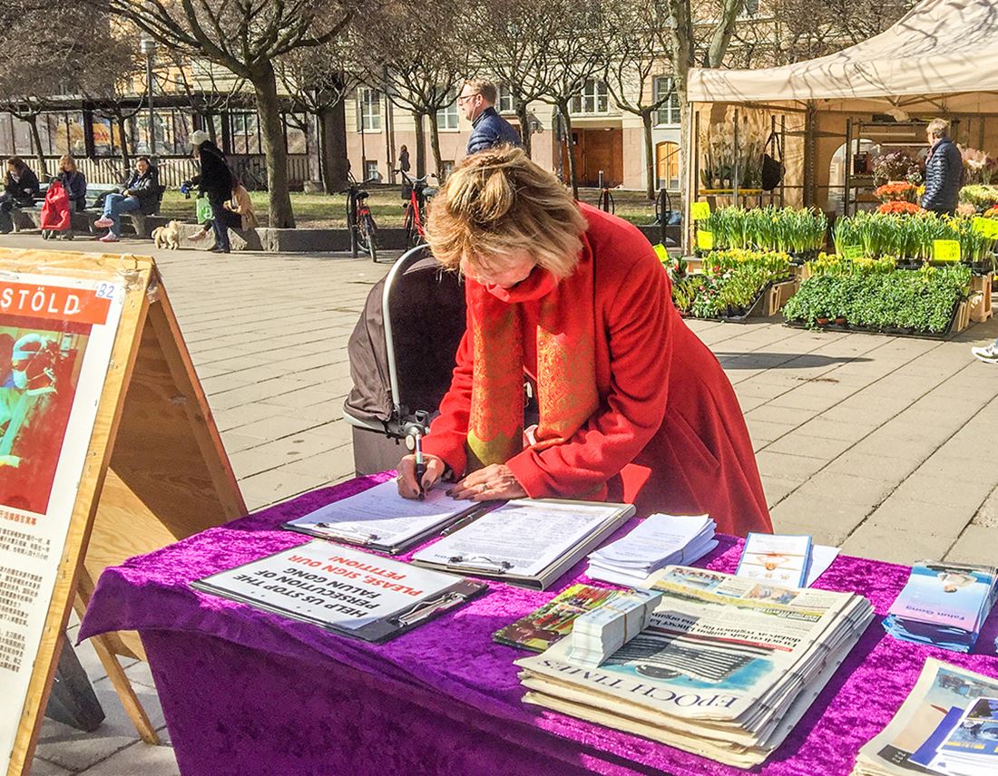 还有一位退休的瑞典外科专家经过活动场地时,停住脚步前来听真相,当听到中共活体摘取法轮功学员器官的罪恶时,她对学员说:“我相信这是真的。退休前我在卡罗林斯卡医院( Karolinska Sjukhuset)工作,我的领导去过中国做移植学术研讨,回来后跟我们讲过在中国发生的类似事情,真是太恐怖啦!我是一个医生,更清楚一个器官匹配的成功要付出多少代价!我敢说,这事(活摘器官)绝对不是个人行为,是政府在犯罪!”她表示一直都在关注着这件事情,谴责中共的残暴行径。