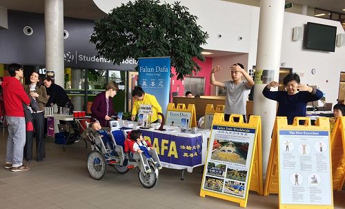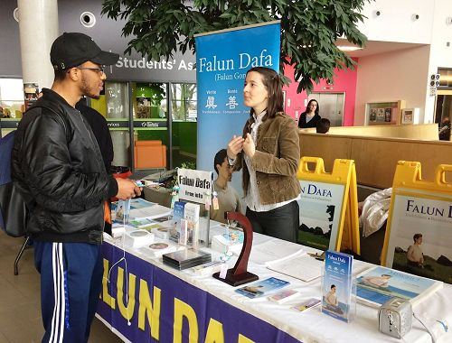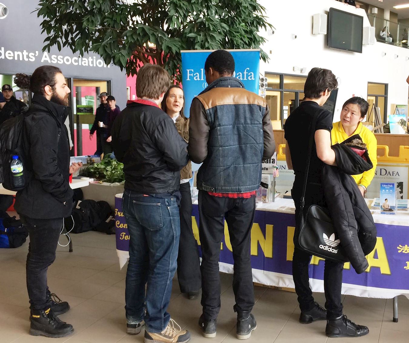 在当天的活动中,有不少该校的学生 、教职员工被法轮功学员们优美、平和的功法演示和法轮功真相展板吸引,许多学生驻足观看。一些学生看到法轮功学员的炼功场面说:“太吸引人了,我一定要看看。”多位亚岗昆学院的教职员工表示,他们此前已经听说过中共迫害法轮功的消息,并主动要求在反迫害的呼吁书上签名。一位兽医专业的女学生也说自己最近开始冥想打坐,她说很有兴趣到渥太华大学学法轮功。