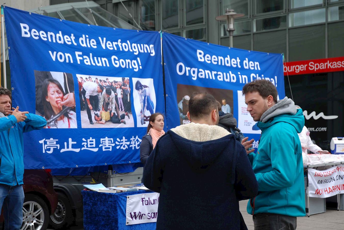 Irina是个三十出头,看上去非常知性的年轻女子。她在一年前已经在汉堡的Abaton影院看过有关中国活摘异见人士器官牟取暴利的影片,今天她和同伴路过,看到巨大的制止活摘的横幅,二话不说就签名反对中共暴行。