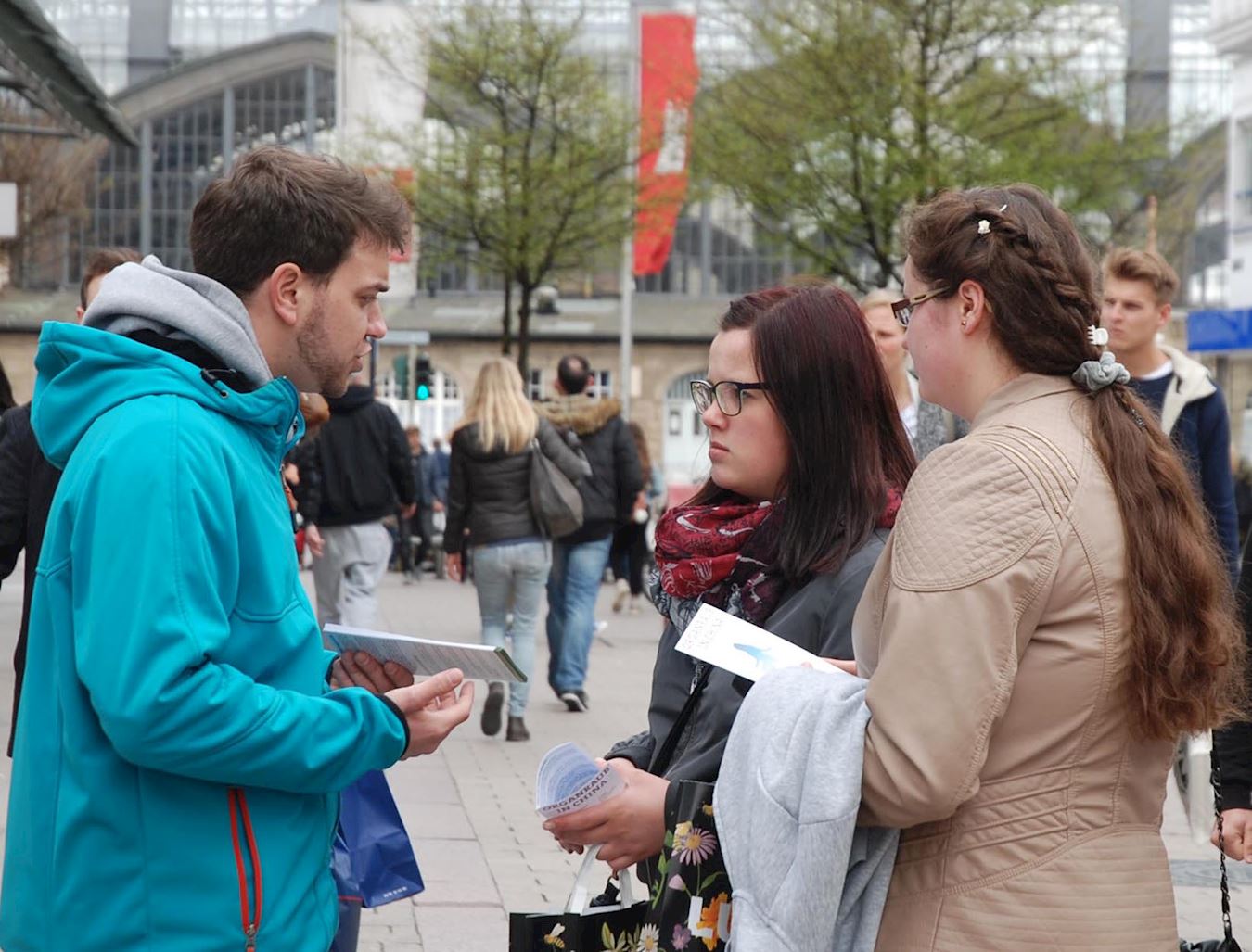 【明慧网二零一七年四月九日】(明慧记者雪莉报道)二零一七年四月八日,汉堡法轮功学员在市中心的施比塔勒街(Spitalerstraße)举办了今年的第一个信息日,向民众揭露中共活摘法轮功学员器官的罪行。严冬已过,春天来临,周末的步行街上行人如织。没有了寒风凛冽,人们或独行或结伴,行色从容,东逛西看,很快就注意到法轮功学员的巨型横幅。