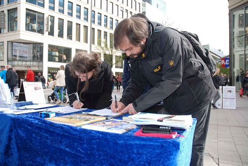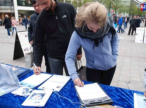 一个四十五岁左右的德国女性走到展位前,告诉法轮功学员:“你们做这件事(讲真相)真是太好了。”她说她自己也是为了讲真话绝不退缩的人:“我们早晚都要离开人世,所以还是说真话吧,没有什么可以害怕的。”当她得知法轮功学员即使在被酷刑折磨的情况下,还是对警察劝善,告诉他们法轮大法真相的时候,她的泪水夺眶而出,说,“我真的发自内心的希望他们(中共)住手。这一切必须马上被制止。”她在制止活摘器官的征签表上签字后,和法轮功学员握别。