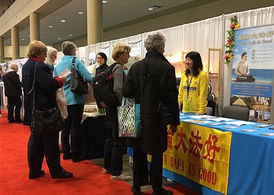 二零一七年加拿大最大的自然健康展于四月下旬在多伦多举行,有两百多个展位,法轮功学员参加了展会,向人们介绍法轮功。