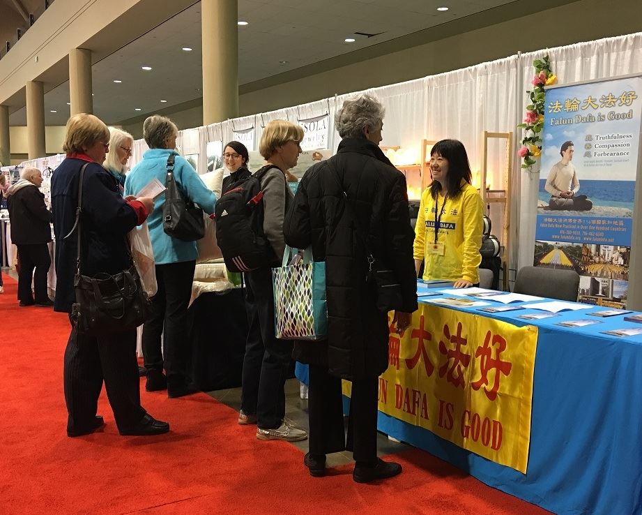安·杰克逊(Ann Jackson)女士和她的朋友看到正在炼功的法轮功学员就在展位前停下脚步,仔细观看和听学员的介绍。学员告诉安女士,中国大陆在一九九八年曾经做过的健康调查报告显示修炼法轮功后祛病健身总有效率超过98%。安女士告诉学员她对法轮功非常感兴趣,临走时留下了她的联系方式希望可以开始学炼法轮功。