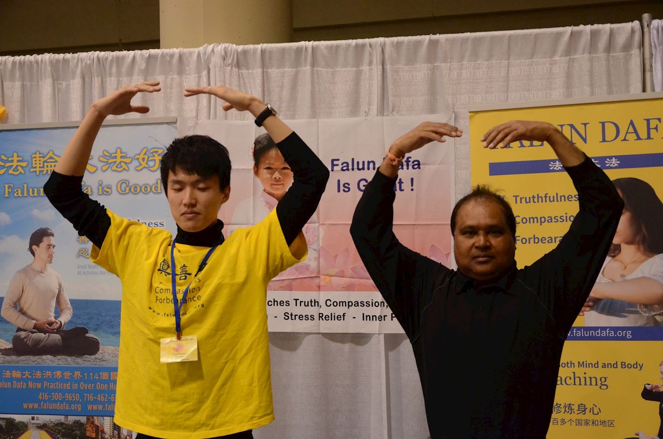 拉什(Rashi)夫妇来自印度,在欧洲和北美生活多年,为了健身尝试过瑜伽等很多方法,这次来健康展希望获得新的惊喜。他告诉学员,和学员呆在一起心里很平和也很舒服:“这里能量很大。”学员向他介绍了法轮功修炼真、善、忍,还有五套功法,拉什先生高兴地学炼了法轮功的法轮桩法。