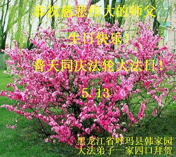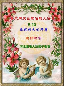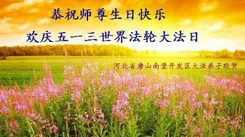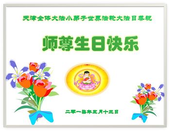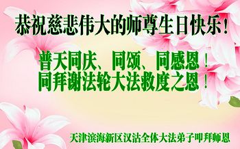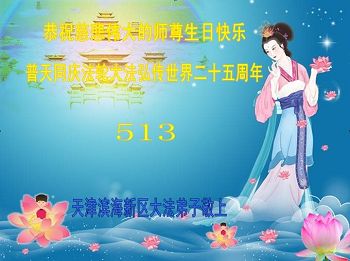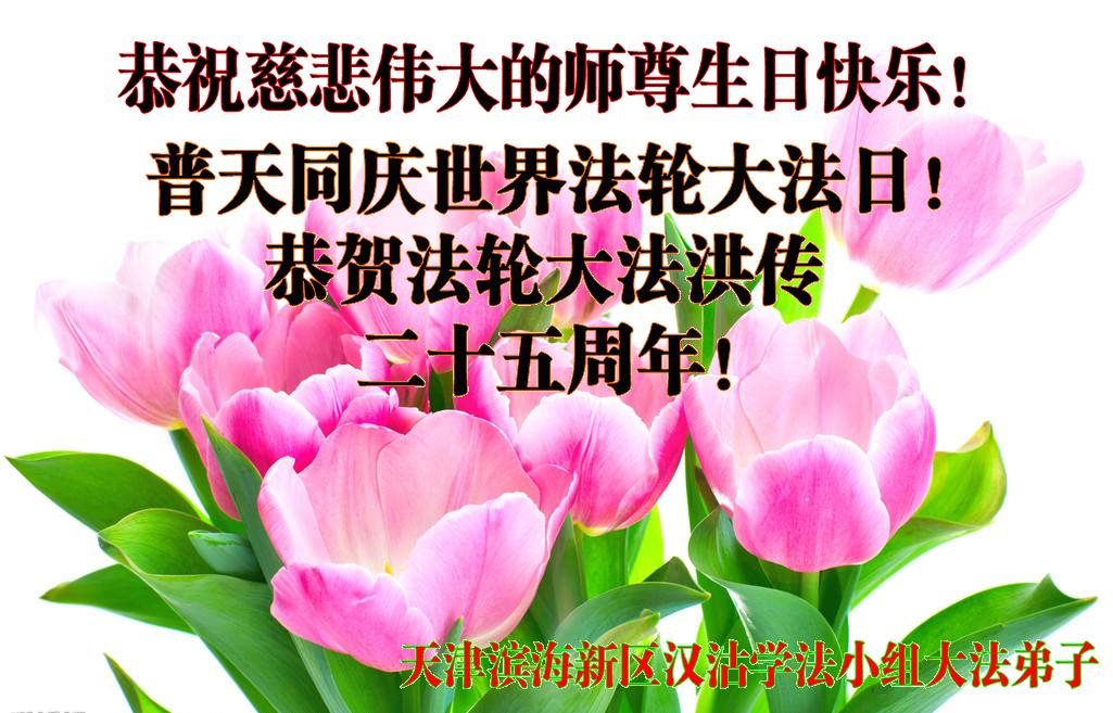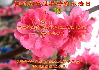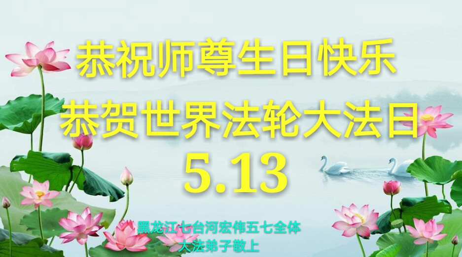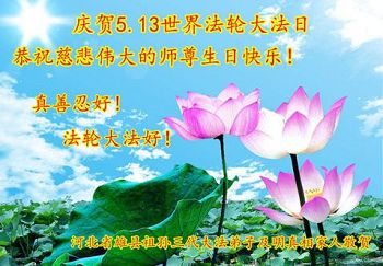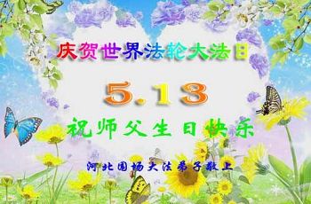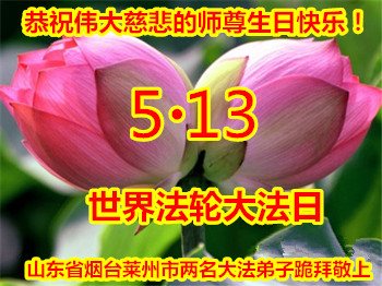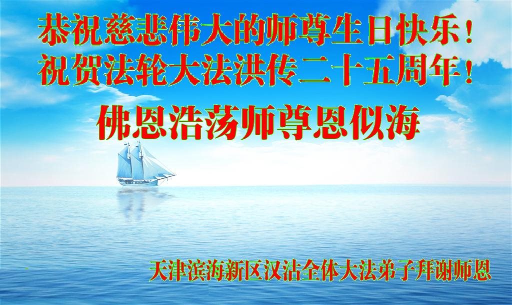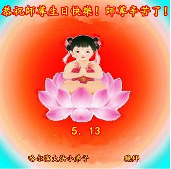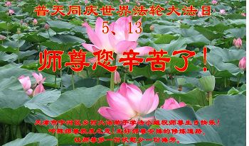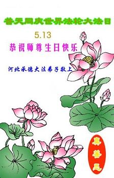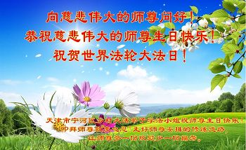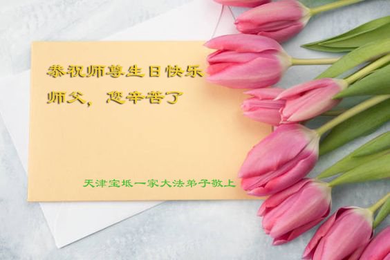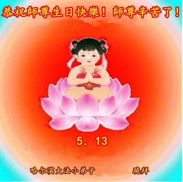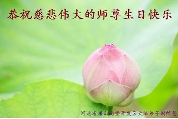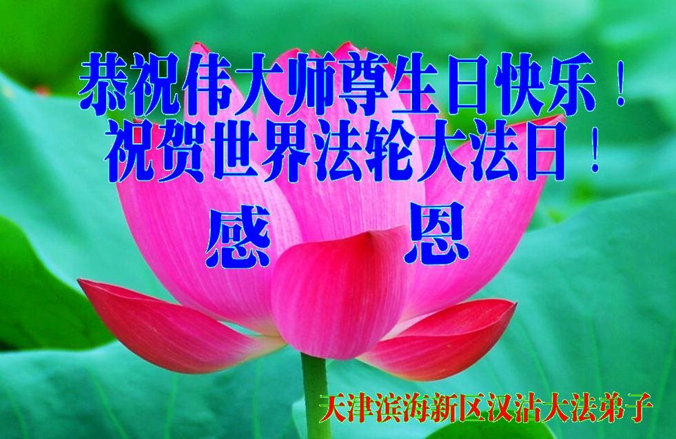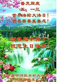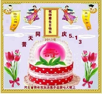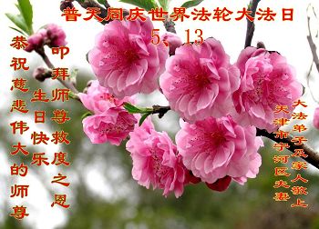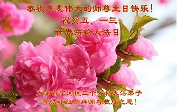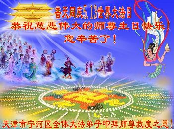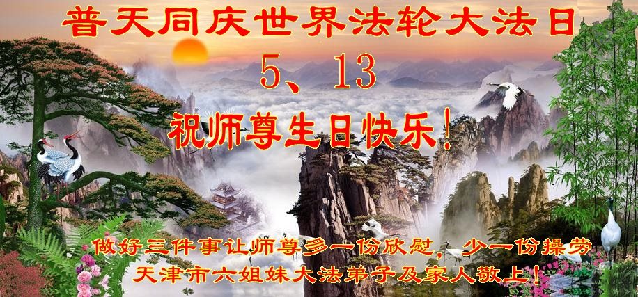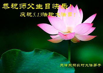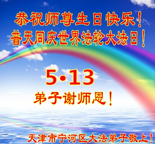 在“5.13”这个感恩的日子,我们天津市宁河区全体大法弟子祝师尊生日快乐!师尊您辛苦了! 我们深知师尊救度一个生命的艰辛,切身体会到一个生命被救度的荣幸!能成为师父的弟子,能成为宇宙大法修炼者中的一员,是多么的幸福!在师父慈悲救度下,在师父的保护与加持下,我们由一个业力满身的人走在了成神的路上,弟子们对师父无限的敬仰,无限的感恩!