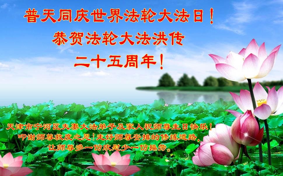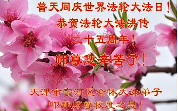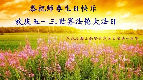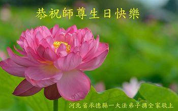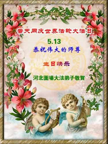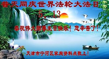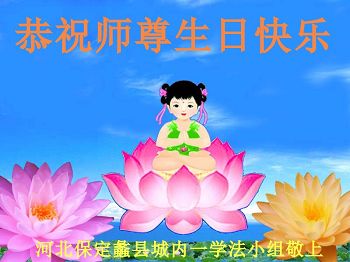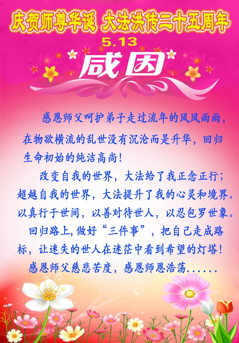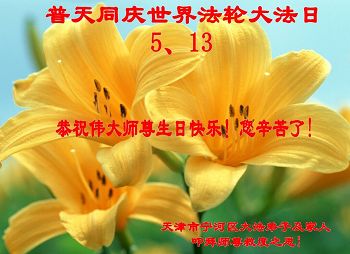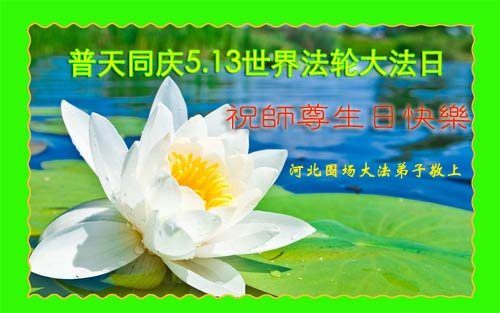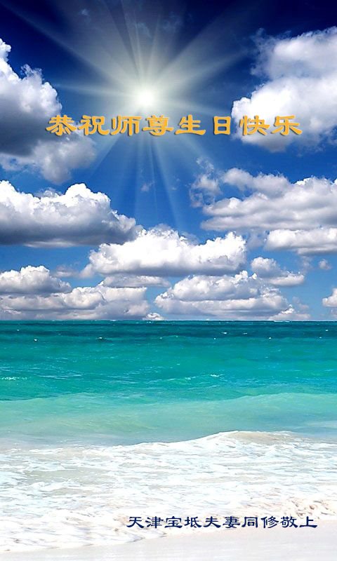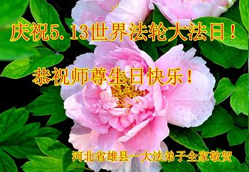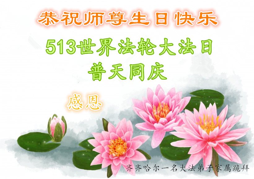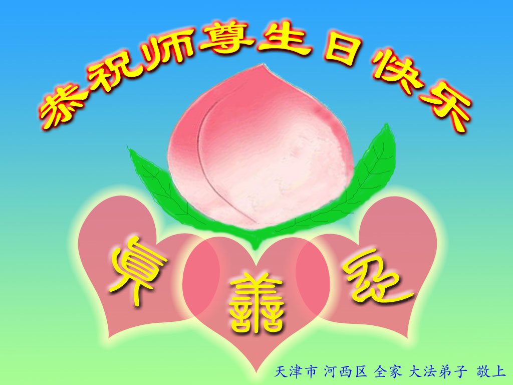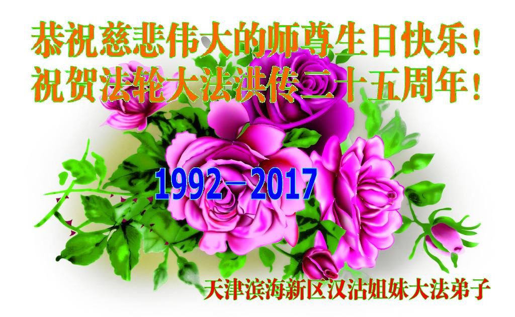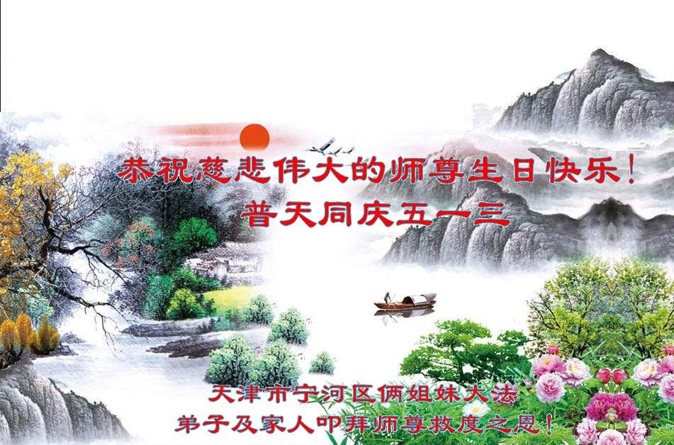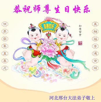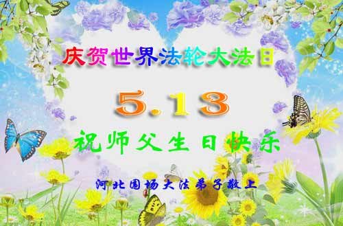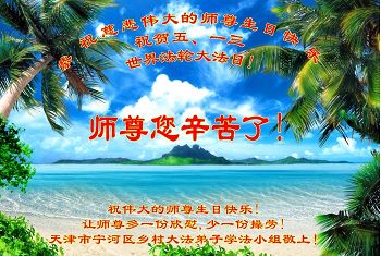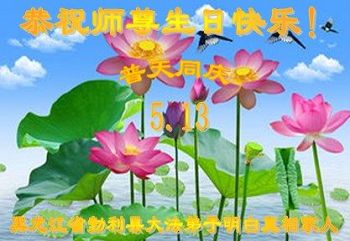 在“5.13”这个感恩的日子,我们天津市宁河区全体大法弟子祝师尊生日快乐!师尊您辛苦了! 我们深知师尊救度一个生命的艰辛,切身体会到一个生命被救度的荣幸!能成为师父的弟子,能成为宇宙大法修炼者中的一员,是多么的幸福!在师父慈悲救度下,在师父的保护与加持下,我们由一个业力满身的人走在了成神的路上,弟子们对师父无限的敬仰,无限的感恩!