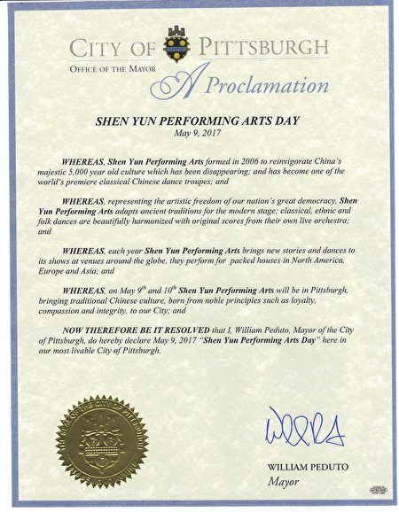 ![]() 图14:匹兹堡市市长郑重宣布二零一七年五月九日为匹兹堡市的“神韵艺术团日”。 |