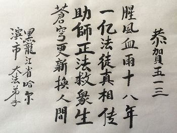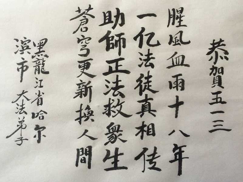 辽宁本溪母女大法弟子是在大法中修炼了二十年的老弟子。她们在贺信中说:“在十八年残酷迫害与艰难救度众生的每天,我们相互配合、搀扶,在恩师的慈悲保护下走到了今天。我们親身感受到了在人间与师父正法同在的无比悲壮、幸运和自豪!”