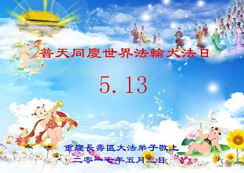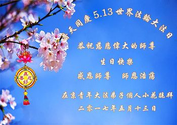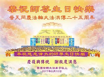 全体澳门大法弟子恭祝慈悲伟大的师尊生日快乐!普天同庆世界法轮大法日!台湾屏东地区法轮功学员恭祝师尊生日快乐!香港理工大学大法弟子恭贺世界法轮大法日暨师尊华诞!恭祝师父生日快乐!