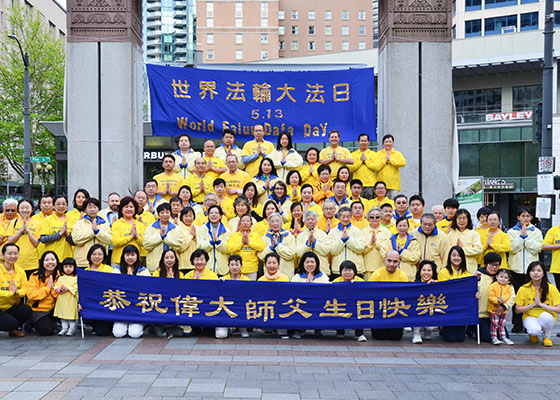 西雅图部分法轮功学员在西雅图市中心的西湖公园欢庆“5.13世界法轮大法日”,恭贺李洪志师父华诞。