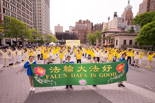 五月十一日, “世界法轮大法日”的巨大横幅竖立在纽约曼哈顿中心车水马龙的联合广场上。近千名法轮功学员在热闹的市中心祥和的炼着法轮功五套功法。