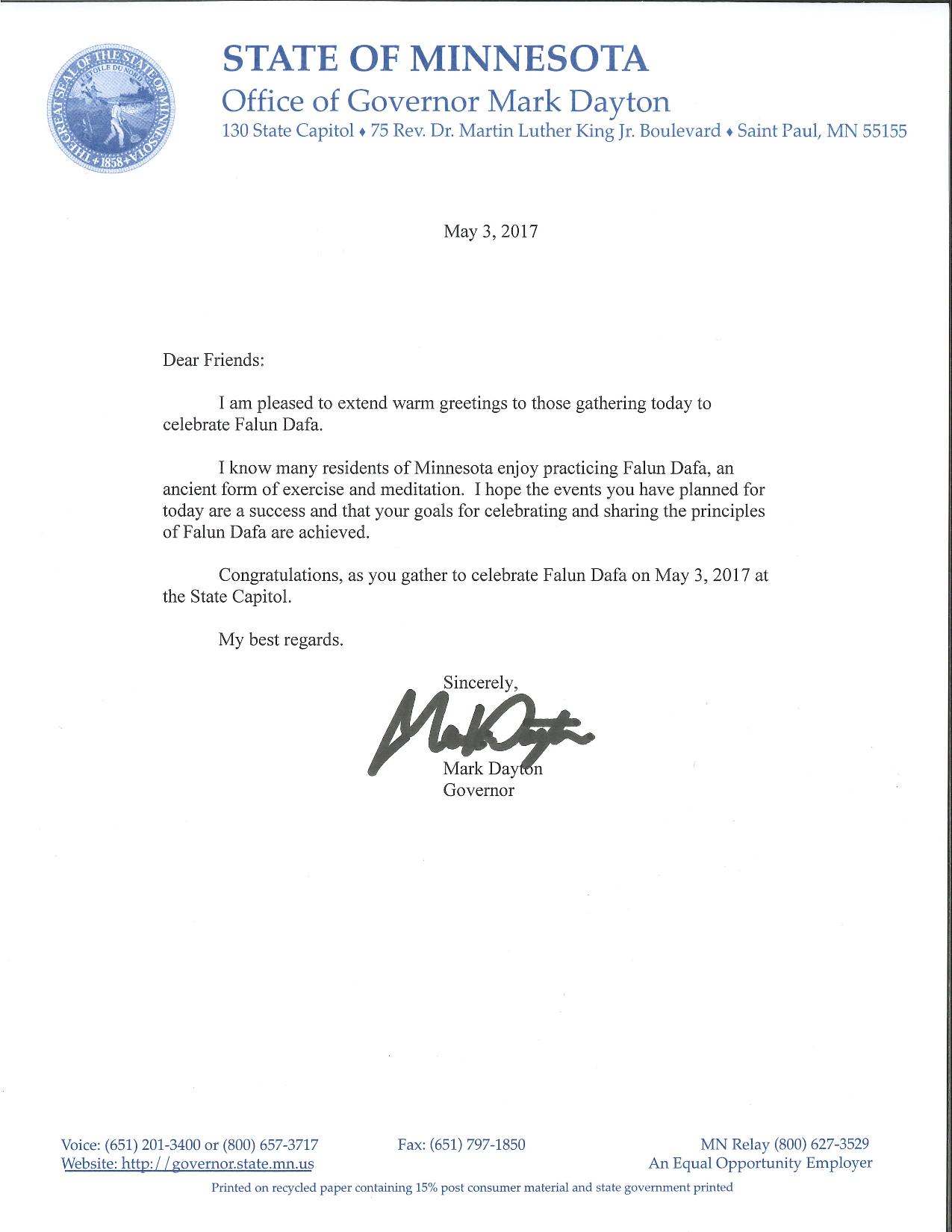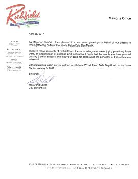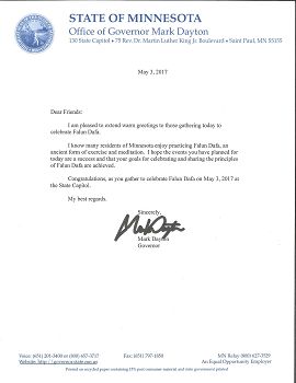 【明慧网二零一七年五月十二日】为庆祝法轮大法洪传世界二十五周年和第十八届世界法轮大法日,美国明尼苏达州州长和多个城市市长纷纷发来贺信和褒奖,表示祝贺。