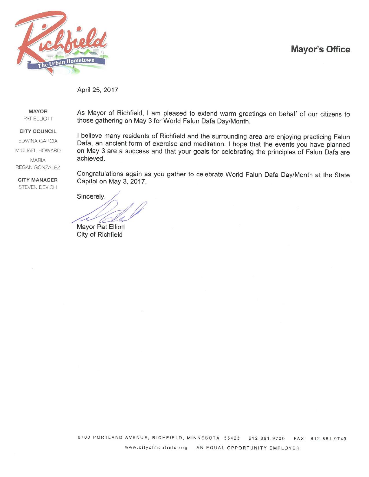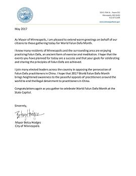 我知道很多明尼阿波利斯市和周边地区的居民们喜爱修炼法轮大法,这一古老的打坐修行方式。我希望你们计划的庆祝活动获得成功,你们庆祝并分享法轮大法修炼原则的目标得以实现。