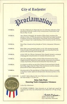 鉴于,明尼苏达州罗切斯特市加入全世界法轮大法修炼者共同庆祝5月13日的世界法轮大法日;
