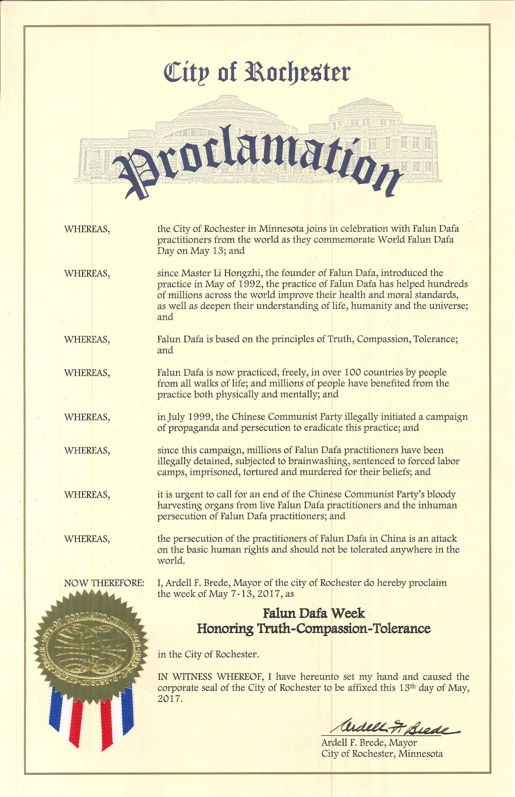 因此,现在,我,阿戴尔·布雷迪,罗切斯特市市长,为褒奖真、善、忍,宣布2017年5月7日至13日这一周,为罗切斯特市市的法轮大法周。