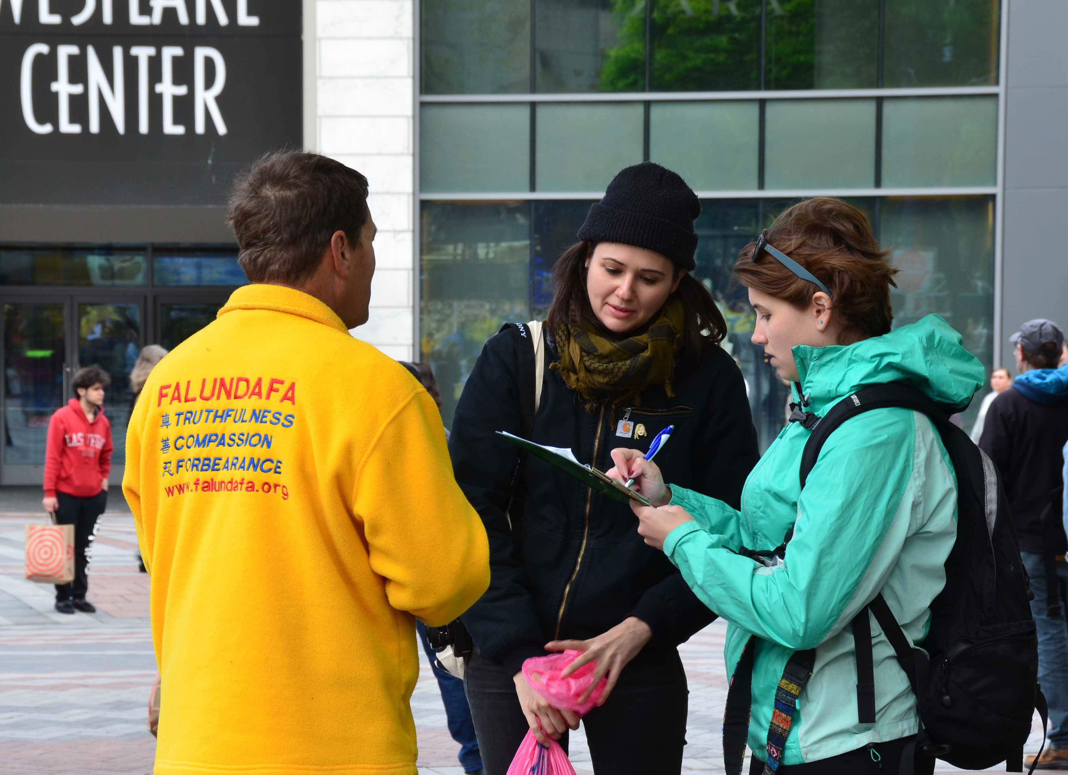 在西雅图中心西湖公园来来往往的行人中很多人都驻足观看法轮功学员炼功。很多人在听到中共不仅迫害修心向善的法轮功学员,还杀害并盗取法轮功学员的器官牟取暴利时,都表示非常气愤。他们毫不犹豫签名反对中共活摘法轮功学员器官。