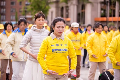 图1-4:五月十一日清晨,各族裔法轮功学员在曼哈顿中城联合广场集体炼功,跟民众分享大法的美好。
