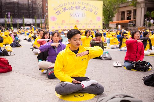 【明慧网二零一七年五月十三日】(明慧记者舒慧纽约报道)五月十一日清晨,晨阳初起,空气中虽有凉意,纽约人一如既往的匆忙;不过,法轮功学员陆续来到曼哈顿中城联合广场,十人一排,在舒缓的音乐中,从容淡定,缓、慢、圆,炼着法轮功功法。不少路人驻足观看,并向学员了解法轮功。法轮功学员们跟他们分享了自己修炼大法身心获益的体会,也表达了对李洪志师父传授大法,令自己身心受益的感恩。
