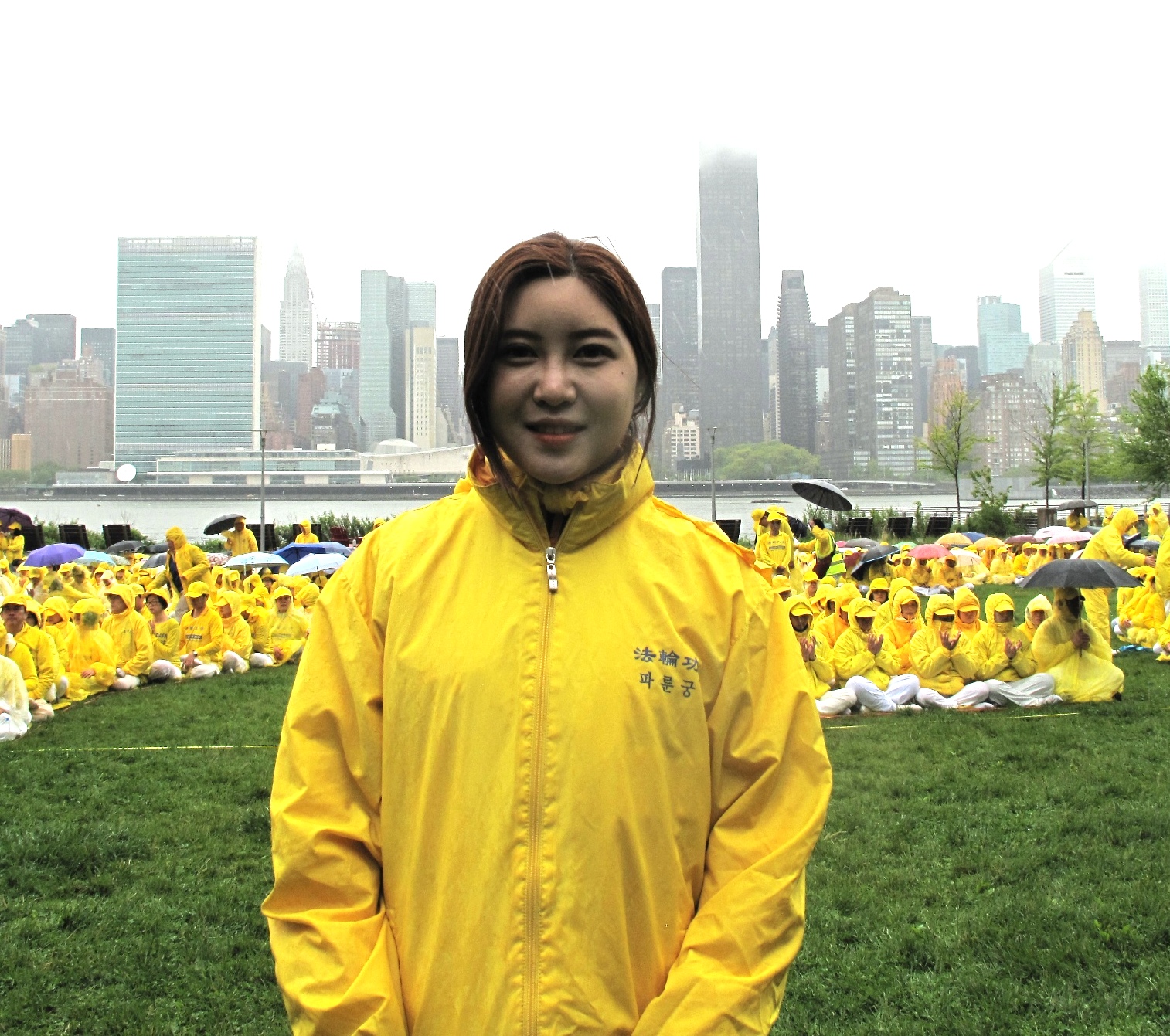 在参加“大法洪传25周年”大型排字的法轮功学员中有一位来自韩国会说中文的女孩,名字叫金懿雅,曾在台湾学习中文。自己说自己十几年前跟着妈妈开始修炼,但在高中、大学求学阶段松懈了,直到二零一五年初,师父再次让她感受大法祛病健身的神奇功效,她又回到大法修炼中来,她说修炼带给她不断的变化,最近感受的一个明显变化就是变得包容些了,原来一定要跟人争的东西现在能比较容易地放下了。