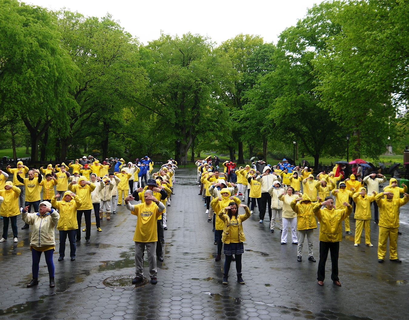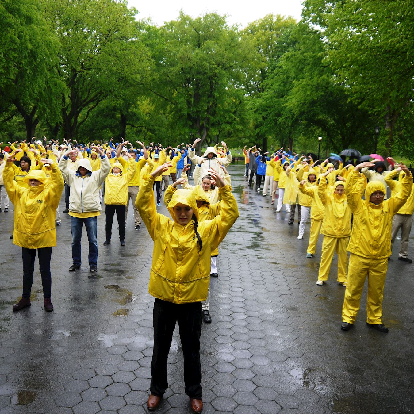 在中央公园,法轮功学员展示五套功法,祥和宁静的能量场吸引在雨中匆匆而行的人们驻足,观看了解法轮功。