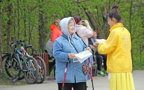 '图3~8:法轮功学员在莫斯科市菲利公园讲真相'