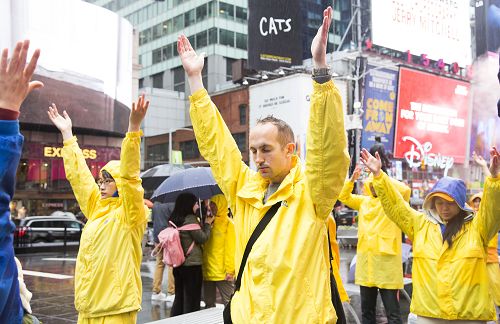 【明慧网二零一七年五月十四日】(明慧记者吴思静美国纽约报道)二零一七年五月十三日上午十点到下午一点,近百名法轮功学员在纽约地标景点时代广场上炼功,向来自世界各地的人们讲述法轮功学员在中国被迫害的真相。尽管下着雨,法轮功学员祥和的炼功场面,吸引了匆匆的路人驻足观看拍照,有的还跟着法轮功学员模仿炼功动作。