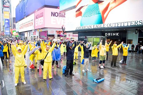 她说:“今天早上,能在时代广场看到人们在这里炼功,非常令人惊艳,尤其是还在雨中。都是黄颜色,它代表和平与光明。黄色安抚心灵。”