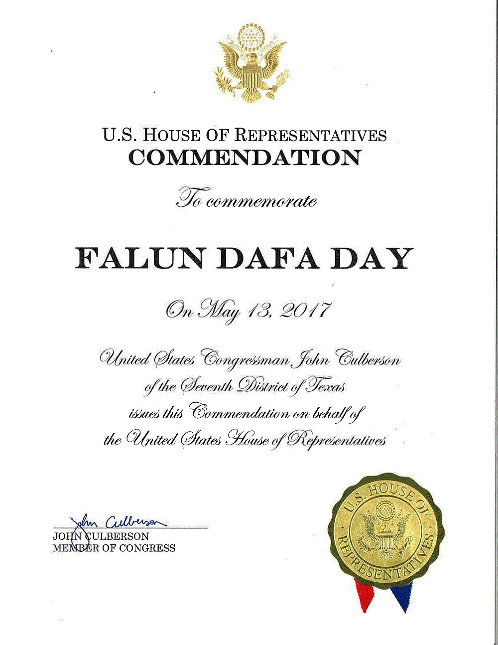 美国国会议员约翰·考伯逊颁发嘉奖令,宣布五月十三日为德州第七选区法轮大法日。