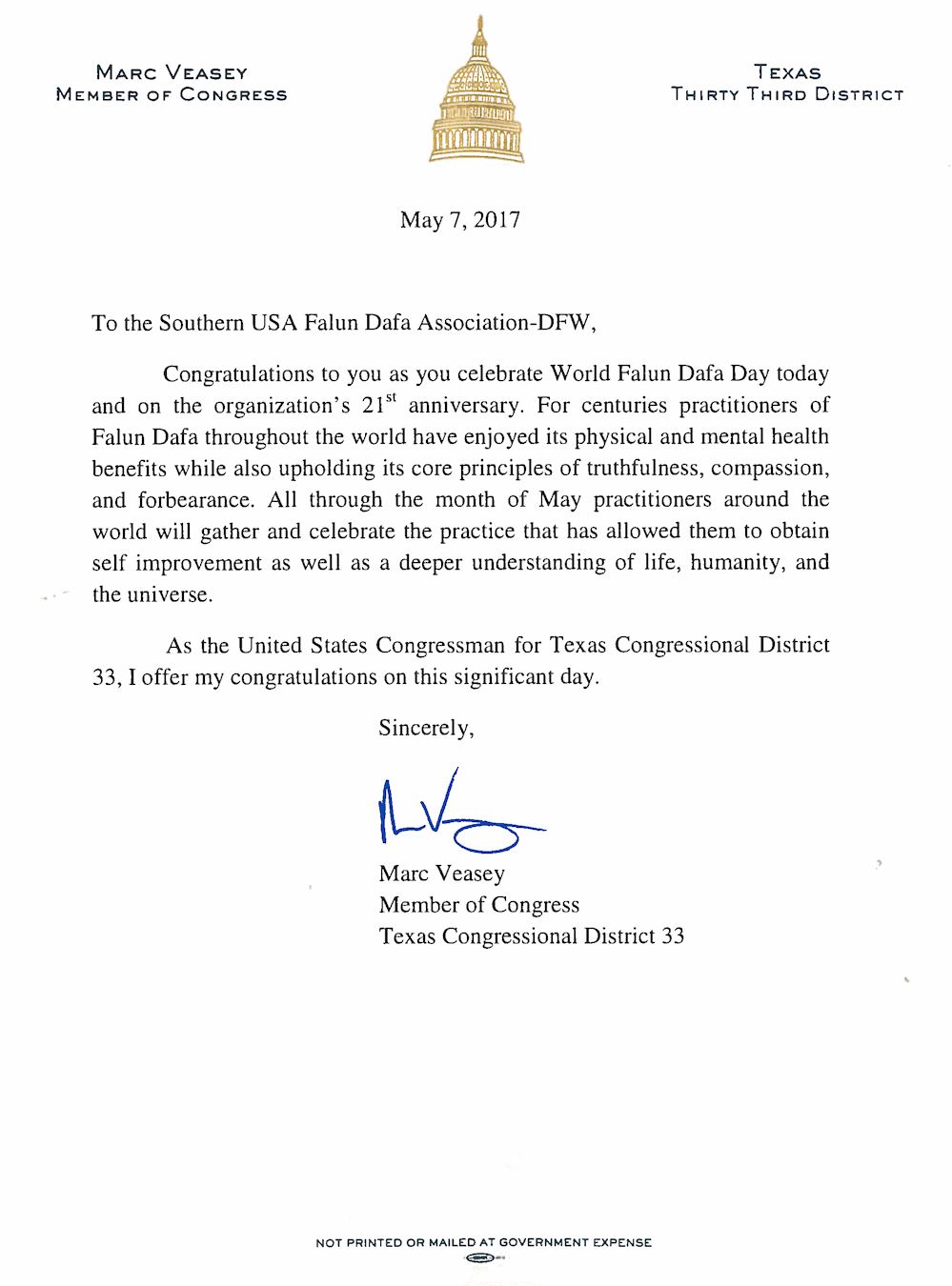 美国德州第三十三选区国会议员马克·维西也在贺信中庆祝法轮大法传到本地区(达拉斯)二十一年,推崇真、善、忍的大法修炼原则对生命意义的深远影响和价值,表示非常荣幸能为此重要节日深深的祝福。
