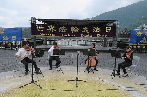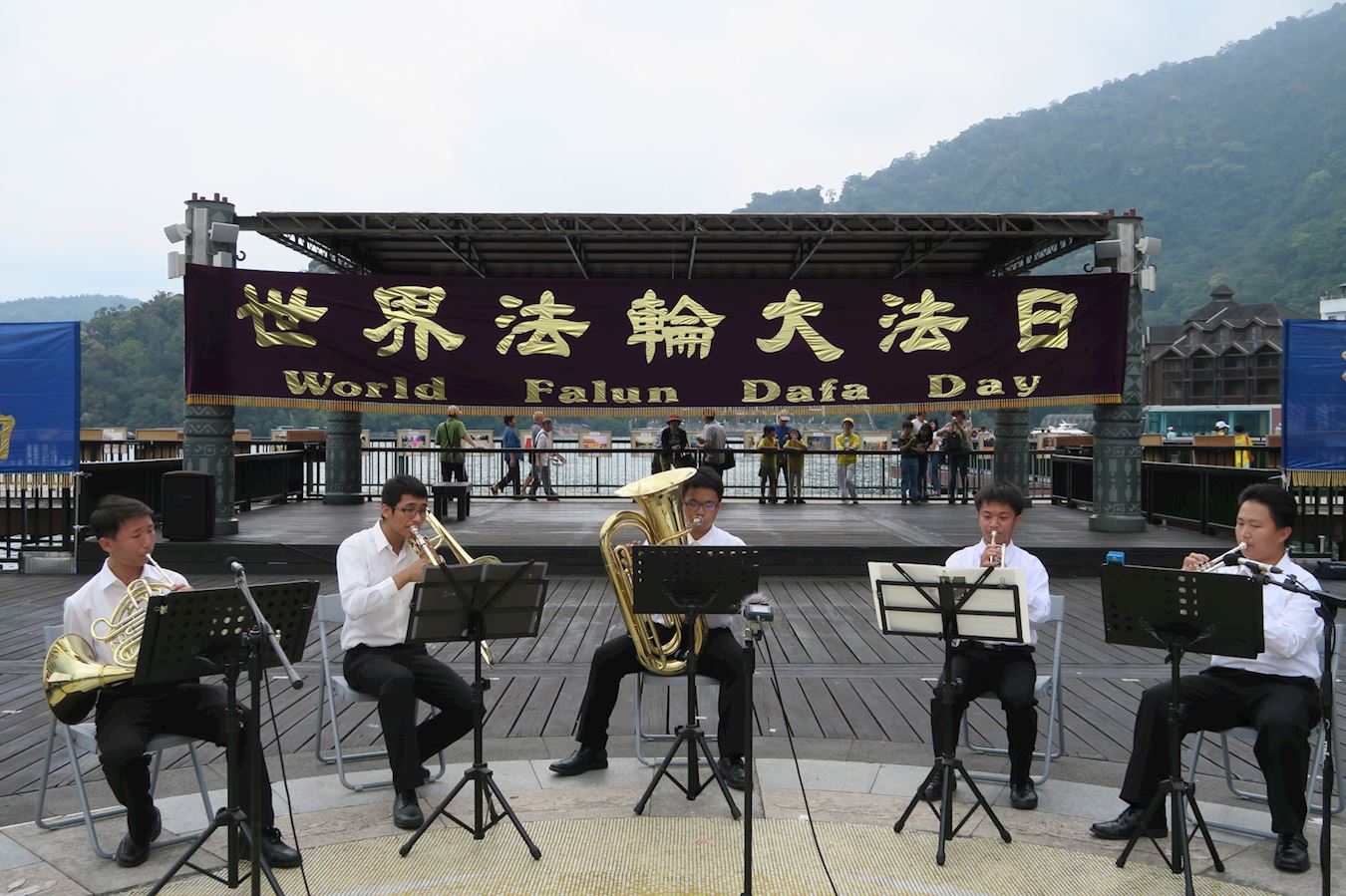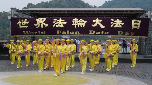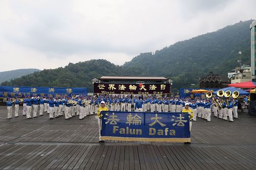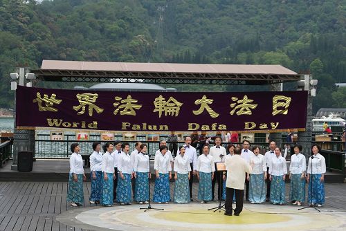 ![]() 图1:台湾中部部份法轮功学员聚集在日月潭伊达邵码头庆祝世界法轮大法日,并恭祝伟大的师尊“生日快乐”! |