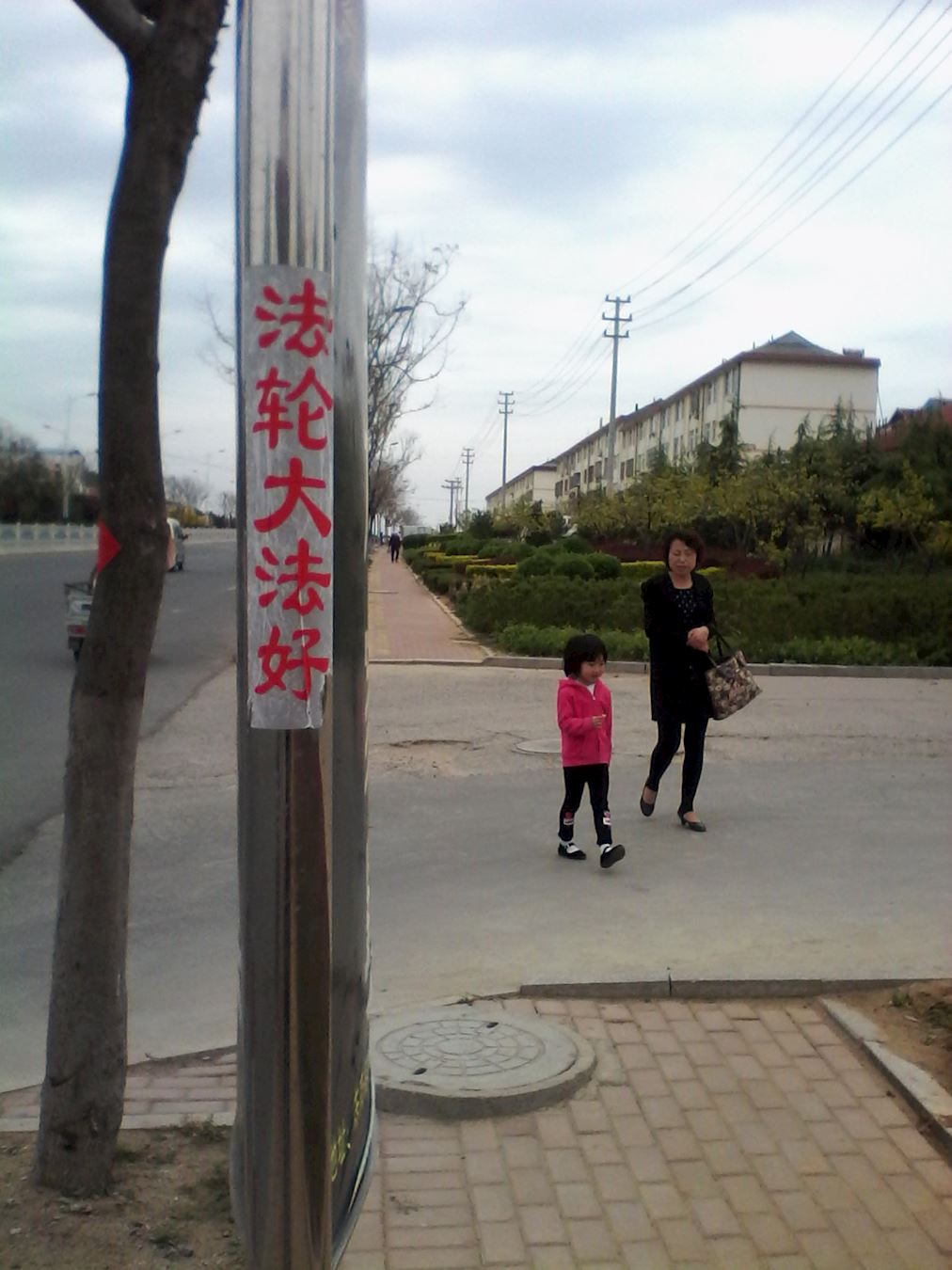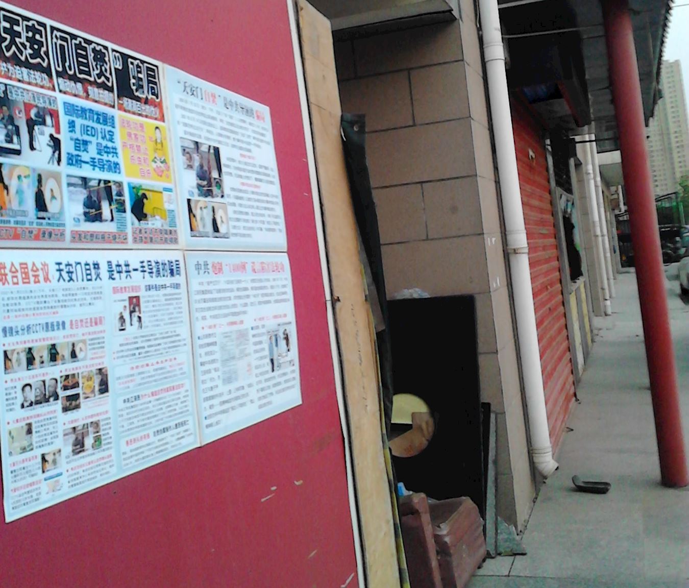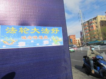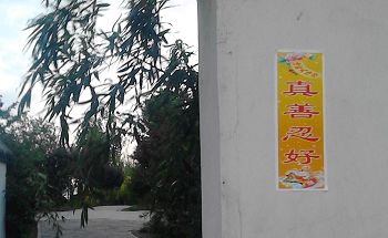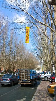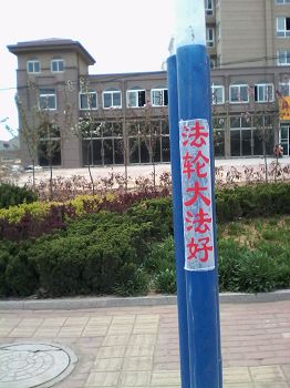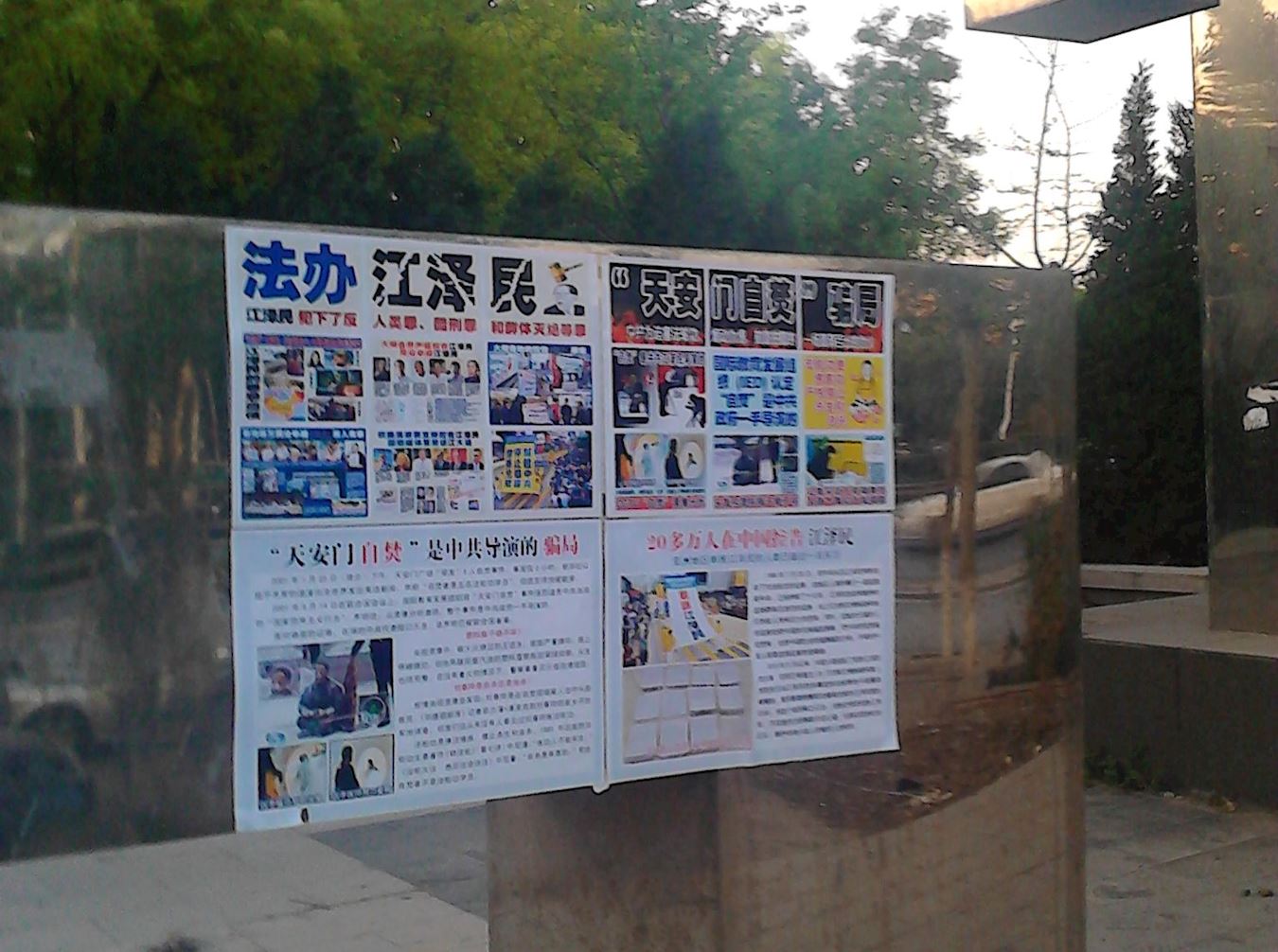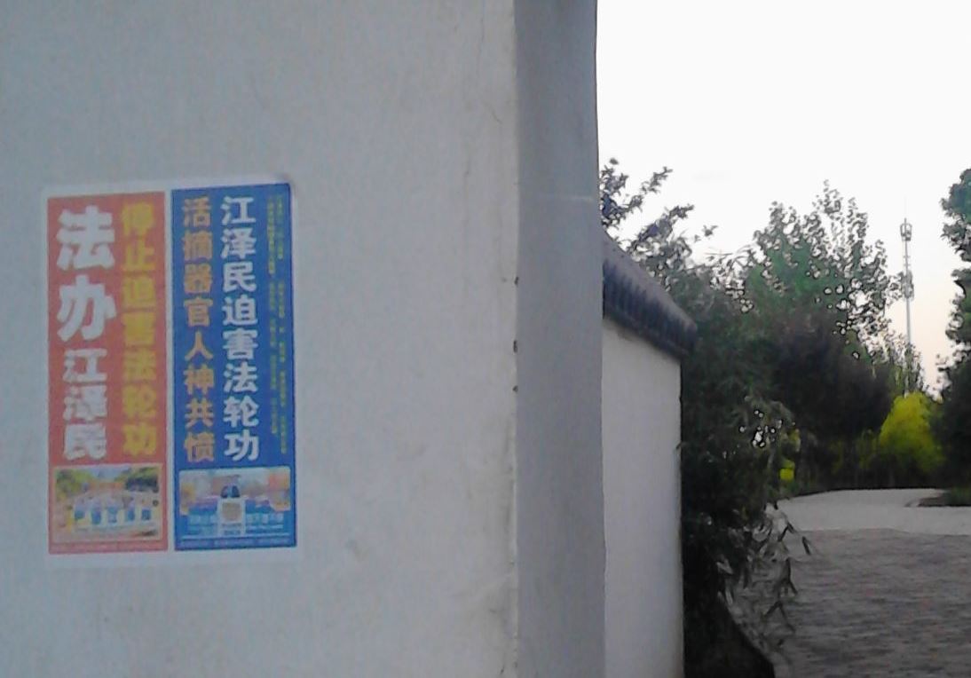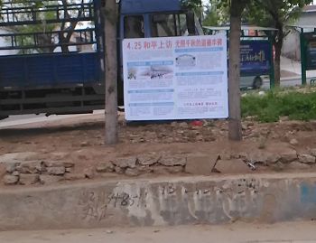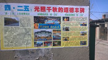 山东省烟台市一乡镇纪念4,25的展板和大法真相粘贴