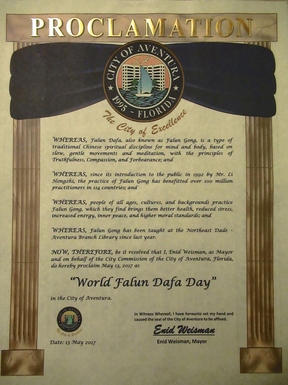 因此,现在,我,伊尼德·韦斯曼(Enid Weisman),代表佛罗里达州阿文图拉市委员会,以阿文图拉市长的名义,特此宣布2017年5月13日为阿文图拉市的“世界法轮大法日”。