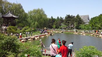 我站在坡地上,想把仙花翠柳掩映的“鸣放宫”照下来,可惜当天我没带相机,只能以手机代相机,照下来的景致不全,从照片的掩映处略略能看到鸣放宫的房檐斗拱,并非全貌。我们又沿着小路继续往西走,游人们三五成群的照相,把小路挤得满满的。 在靠近鸣放宫时,又有一座小凉亭。