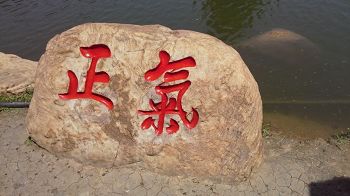 绕过花坛不远处,出现一座拱形小桥,小桥下是潺潺的流水,两岸杨柳青青,仙花铺就。在小桥的南岸坐落着一个凉亭,凉亭旁几棵垂杨柳随风摇摆,牡丹花丛散落在漫坡上,美不胜收。清凉的淙淙溪流边,一块醒目的石雕卧在水溪边, “正氣”两个大字熠熠生辉。天哪!我不禁感叹,万物皆有灵啊!这块石雕仿佛是在告诉世人,法轮大法曾在这里洪传,光耀寰宇,给这一方众生带来无限生机。那雕塑者也许就是神的使者吧,用这种方式警醒人,告诫世人二十几年前,创世主曾在这里传法,这可是宝地呀。