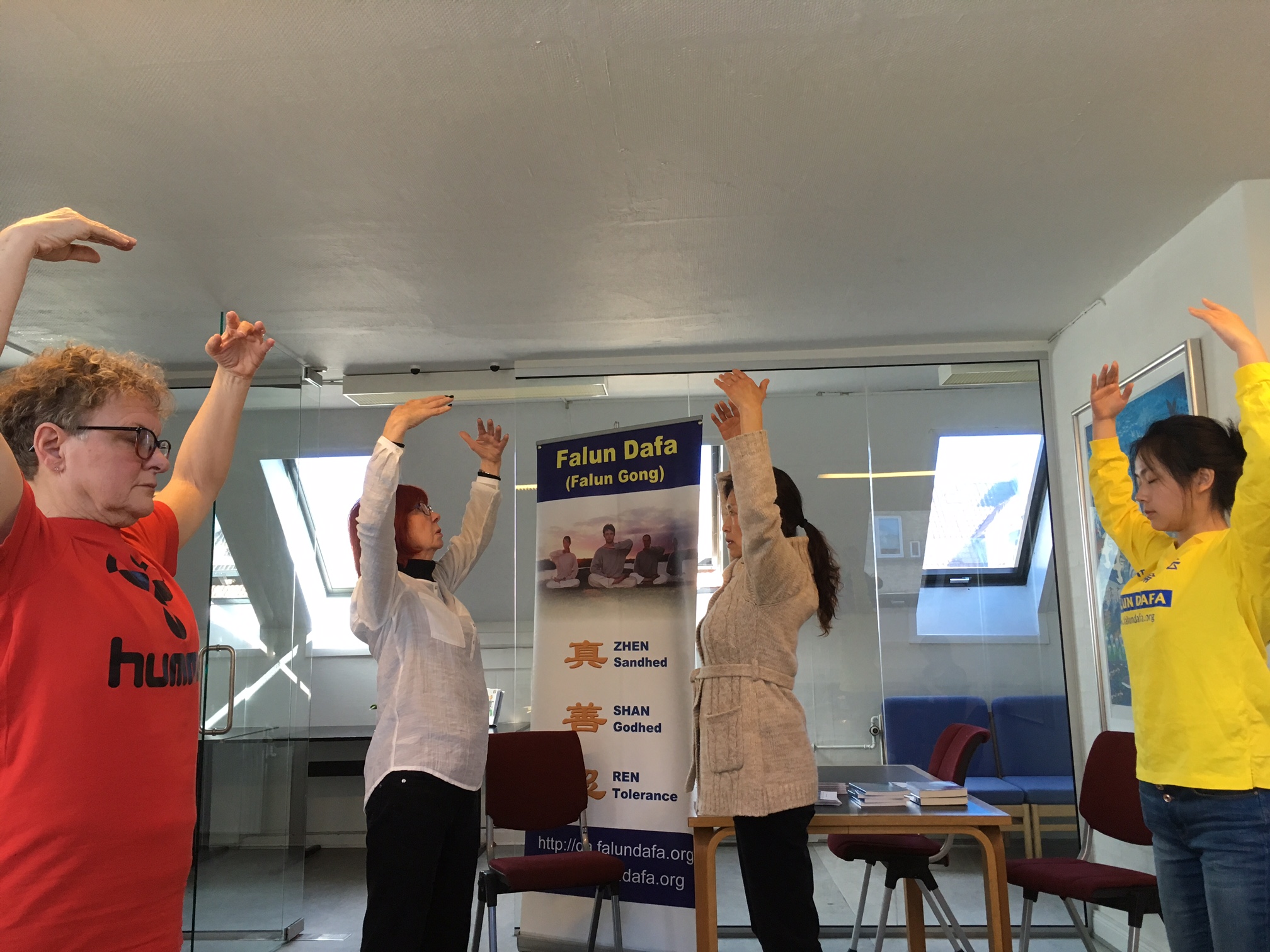 下午,法轮功学员教授了与会者法轮功的五套功法。Birthe和她的女友开车将近一个小时从周边的小城市赶来参加讲座。学功时,她炼着炼着感觉全身发热,她说:“这个感觉很好,能量强和以前常做的运动不一样,能量很强。”