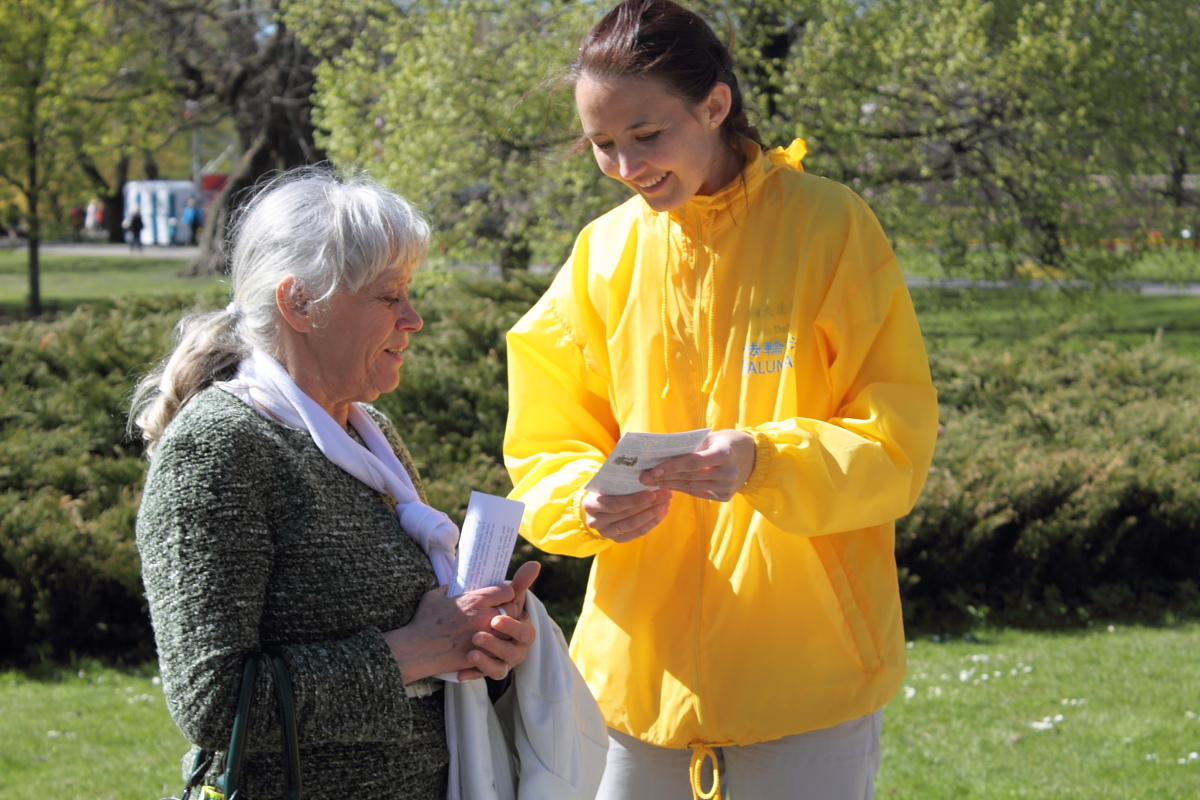 一位女士也对法轮功的活动很感兴趣,她说她的女儿在香港,是一名教师,可是从来没有听说过对法轮功的迫害。学员们告诉她,香港是自治区,法轮功学员的活动都是自由公开的,然而在中国大陆,法轮功学员每天都受到迫害的威胁,甚至被活摘器官。这名女士表示很难过和遗憾,并感谢学员让她了解了这么多的真相。