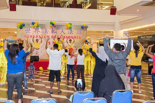 五月十二日,巴淡岛法轮功学员获得了机会能在百货公司庆祝世界法轮大法日,并向观众介绍法轮功。在此,法轮功学员演出腰鼓队以及示范法轮功动作,许多学员向来客发资料。