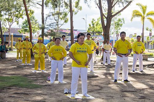 ![]() 图1-2:巴淡岛法轮功学员在阿吉石-圣淘沙区示范法轮功的炼功动作 |