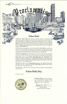 鉴于,法轮大法于一九九二年首次在中国传播,一九九六年洪传至休士顿。自此以后,在图书馆和公园举行许多法轮大法免费学习班,法轮大法修炼者参加了许多社区活动。面临着来自中国共产党的残酷迫害,法轮大法修炼者以决心和勇气坚守真、善、忍,向世界展示了生命的价值和人性的尊严。