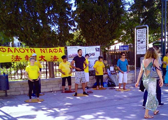 五月二十一日,法轮功学员来到塞浦路斯第二大城市Limasol,在市中心城堡附近的小广场集体演示五套功法,吸引很多游人前来了解法轮功。