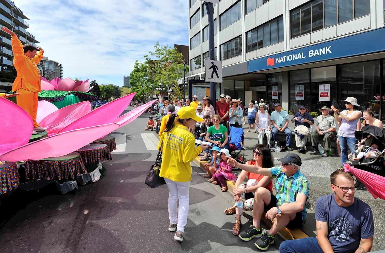 '图4:法轮功学员在加拿大卑诗省维多利亚日一百五十周年庆典游行沿途派发真相资料'