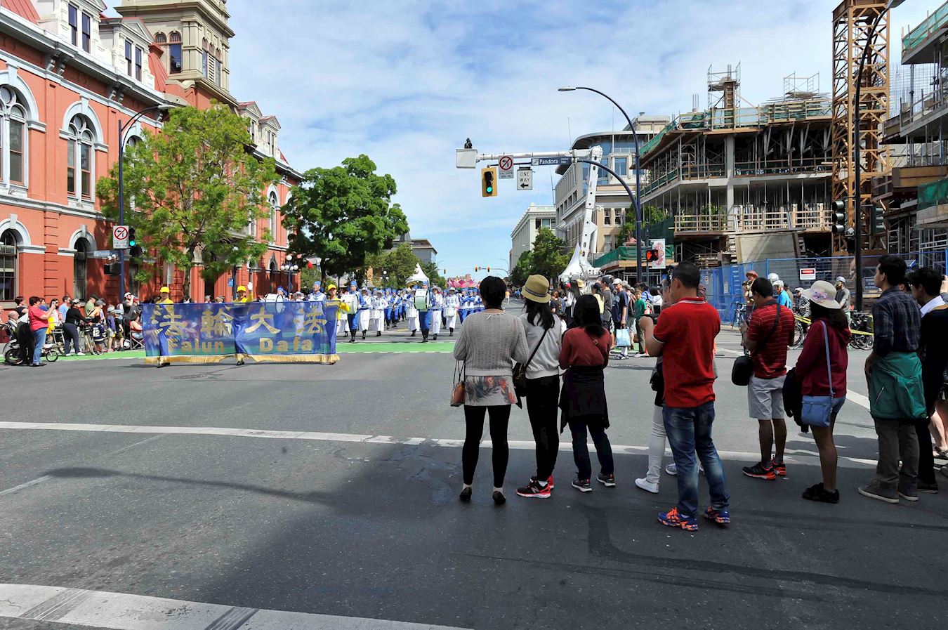 图5:华人观众观看加拿大卑诗省维多利亚日一百五十周年庆典游行中的法轮功团队
