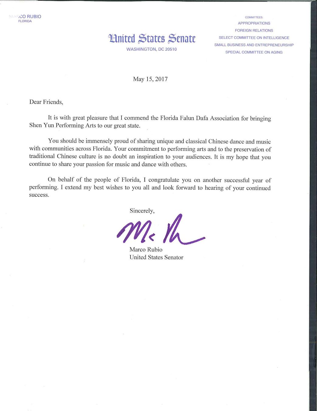 ![]() 图:佛罗里达州迈阿密的美国联邦参议员、美国国会中国问题常务委员会(Congressional-Executive Commission on China)共同主席马可·鲁比奥(Marco Rubio)给佛罗里达法轮大法协会发来贺信 |
