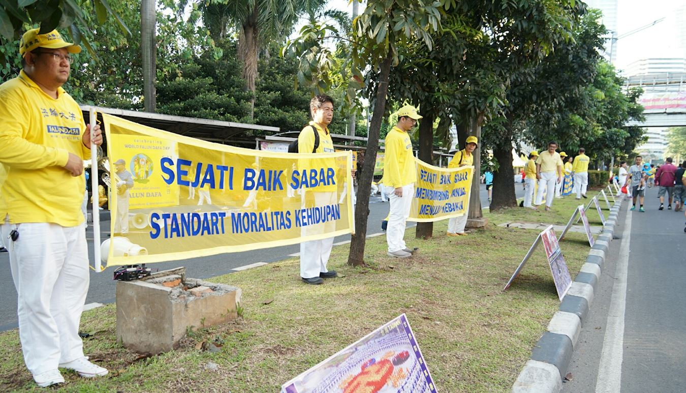 ![]() 图2:学员们举横幅向人们展示法轮大法的美好 |