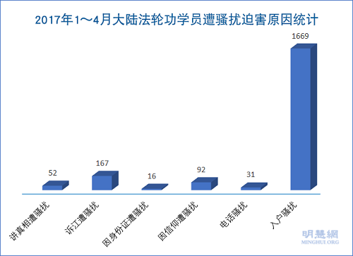 根据明慧网2017年1-4月报道所做的不完全统计,1-4月全国各地至少有2027人次遭非法骚扰。遭非法抄家的约有343人次,非法抄走现金约44100元,非法勒索现金约3万元。给法轮功学员的生活、工作造成了极大麻烦,有的法轮功学员甚至遭受很大的经济损失,精神上也受到了严重伤害。