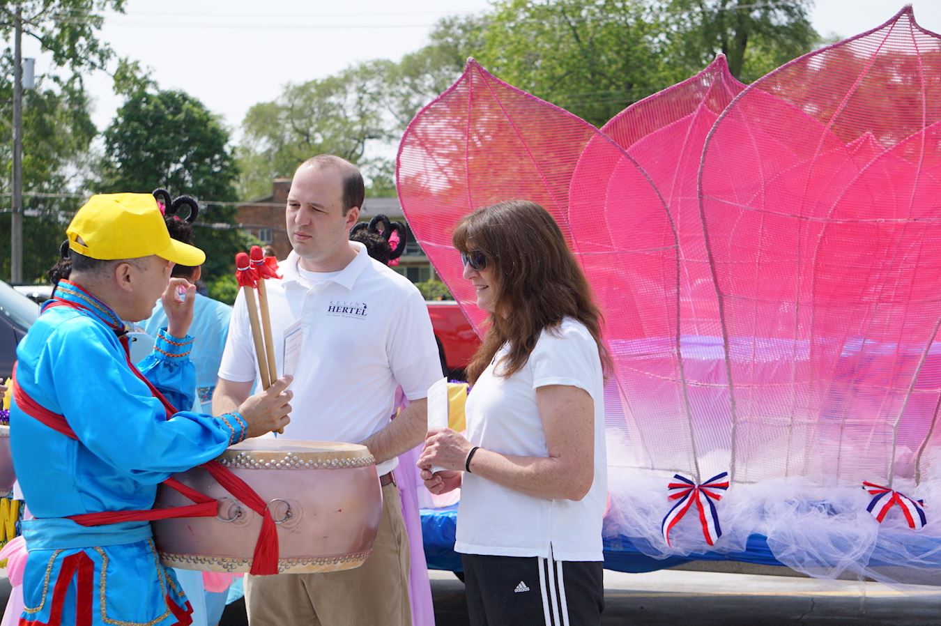 游行开始前,州参议员Kevin Hertel和郡委员会委员Veronica Klinefelt女士驻足法轮功学员的花车旁聆听了真相,并欣然和参加游行的法轮功们合影,表示支持。 Kevin Hertel表示:“感谢你们的到来,体现了我们社区的多元化,你们的到来让我们这个地区更伟大,非常高兴能和你们一起度过这个节日。”Klinefelt女士表示很高兴有机会了解其他文化,欣赏其他文化,法轮功学员的到来让她“感觉很棒!”
